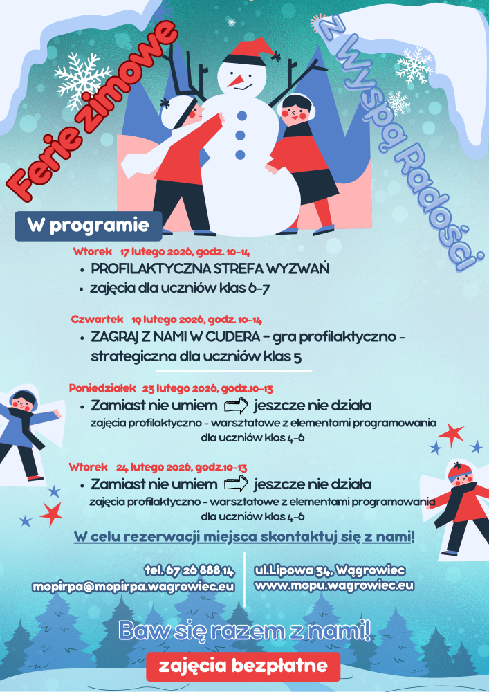 Miejski Ośrodek Profilaktyki Uzależnień przygotował na ferie zimowe 2026r. ofertę zarówno dla dzieci i młodzieży na co dzień korzystających ze Świetlicy „Wyspa Radości” jak i tych młodych mieszkańców Wągrowca, którzy chcieliby wykorzystać swój wolny czas uczestnicząc w ciekawych, inspirujących i pobudzających kreatywne myślenie zajęciach profilaktycznych.